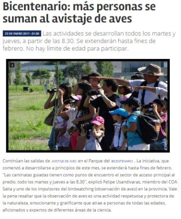 Continúan las salidas de AVISTAJE DE AVES en el Parque del BICENTENARIO. La iniciativa, que comenzó a desarrollarse a principios de este mes, se extenderá hasta fines de febrero. "Las caminatas guiadas tienen como punto de encuentro el sector de acceso principal al predio, todo los martes y jueves a las 8.30", explicó Felipe Usandivaras, miembro del COA Salta y uno de los impulsores del birdwatching (observación de aves) en la provincia. Vale la pena resaltar que la observación de aves es una actividad respetuosa y protectora de la naturaleza, emocionante y gratificante que atrae a personas de todas las edades, aficionados y expertos de diferentes áreas de la ciencia.