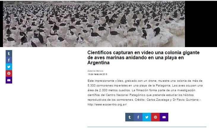 Este impresionante vídeo, grabado con un drone, muestra una colonia de más de 5.300 cormoranes imperiales en una playa de la Patagonia. Las aves ocupan una área de 2.000 metros cuadros. La filmación forma parte de una investigación científica del Centro Nacional Patagónico que pretende estudiar los hábitos reproductivos de los cormoranes.
