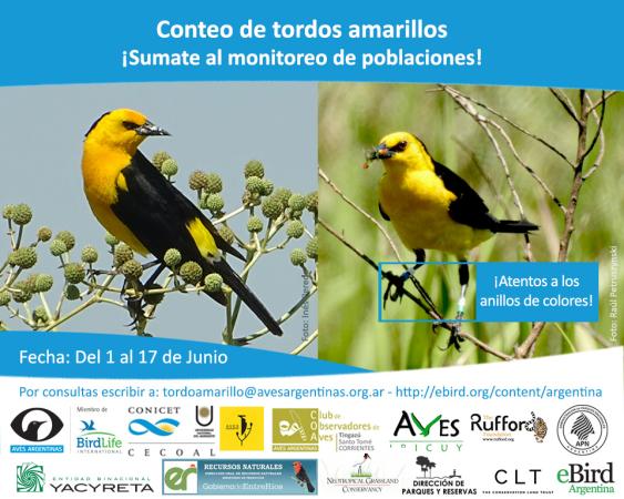 ¡Los invitamos a salir con nosotros y así poder cubrir más sitios! Hay que estar especialmente atentos a los anillos de colores que pusimos en las patas de algunos individuos para poder identificarlos. Cada individuo anillado tiene un código de color específico. Toda la información deberá ser cargada en el portal de eBird. La localización precisa de los sitios será resguardada en el sistema. Si tenés consultas u otra información escribinos a tordoamarillo@avesargentinas.org.at