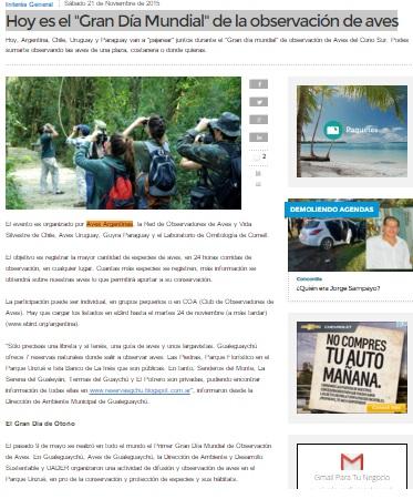 El pasado 9 de mayo se realizó en todo el mundo el Primer Gran Día Mundial de Observación de Aves. En Gualeguaychú, Aves de Gualeguaychú, la Dirección de Ambiente y Desarrollo Sustentable y UADER organizaron una actividad de difusión y observación de aves en el Parque Unzué, en pro de la conservación y protección de especies y sus hábitats.