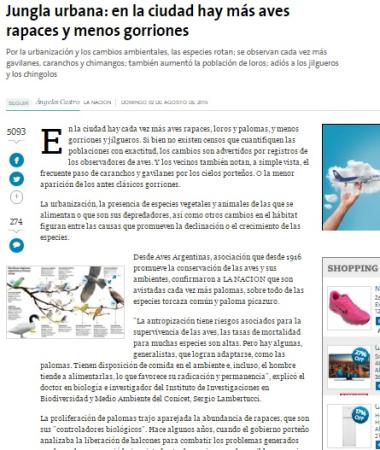 En el mismo sentido, Lambertucci recordó que la infraestructura de las grandes ciudades es enemiga de las aves. "No sólo pierden su hábitat natural. Los edificios, los cableados, los vehículos son amenazas constantes y causa de mortalidad. También la expansión de los carnívoros, gatos y perros domésticos, atenta contra las aves. Ningún ecosistema podría sostenerse con la densidad de carnívoros que tienen las ciudades", concluyó.