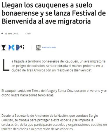 El "Festival de Bienvenida a los Cauquenes Migratorios" que recalarán en este otoño en la provincia de Buenos Aires se realizará el martes 19 de mayo en la ciudad de Tres Arroyos, donde se desarrollarán avistajes, charlas y proyecciones para los alumnos de la región a fin de concientizar sobre la importancia de este ave migratoria y de su protección.