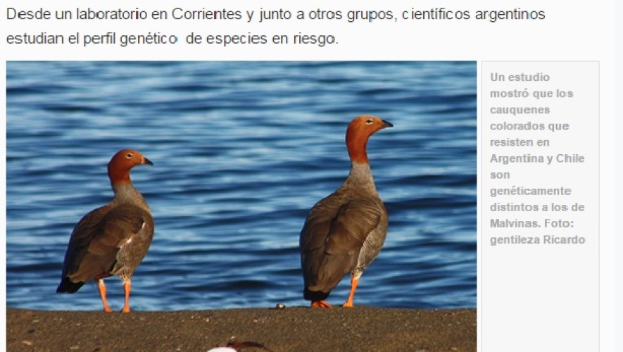En 2012, un grupo de científicos comenzó a estudiar la variación genética de los cauquenes, una familia de aves sudamericanas del orden de los patos, también conocidos como gansos australes o avutardas; prestando especial atención a los cauquenes colorados que habitan en el sur de Argentina y Chile, así como también en las Islas Malvinas. Investigadores del Laboratorio de Biología de la Conservación del Centro de Ecología Aplicada del Litoral (CECOAL, CONICET-UNNE), participan de este estudio, que es pionero en la aplicación de técnicas genómicas en una especie de ave en peligro de extinción en el país.