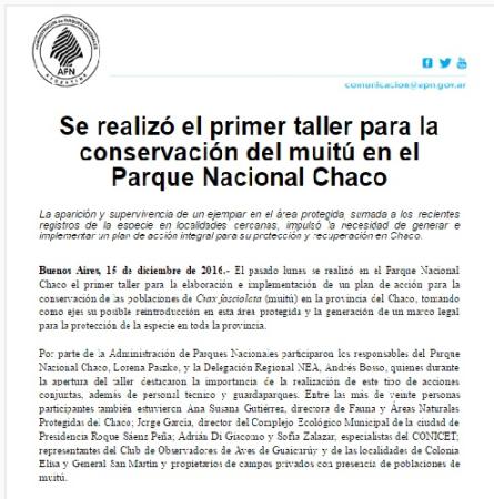 Buenos Aires, 15 de diciembre de 2016.- El pasado lunes se realizó en el Parque Nacional Chaco el primer taller para la elaboración e implementación de un plan de acción para la conservación de las poblaciones de Crax fasciolata (muitú) en la provincia del Chaco, tomando como ejes su posible reintroducción en esta área protegida y la generación de un marco legal para la protección de la especie en toda la provincia.