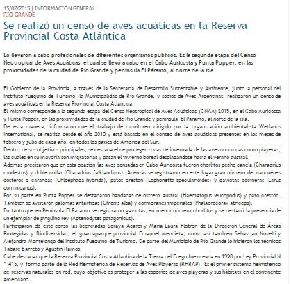 El mismo corresponde a la segunda etapa del Censo Neotropical de Aves Acuáticas (CNAA) 2015, en el Cabo Auricosta y Punta Popper, en las proximidades de la ciudad de Río Grande y península El Páramo, al norte de la isla.