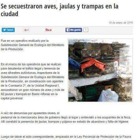 En el marco de los operativos que se realizan para desalentar el tráfico ilegal y tenencia de aves silvestres autóctonas, inspectores de la Subdirección General de Ecología del Ministerio de la Producción, en coordinación con agentes de la Comisaría 2ª, de la Unidad Regional I, secuestraron un gran número de aves y más de 60 jaulas y trampas en Barrio Alfonso en la capital provincial.