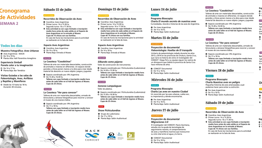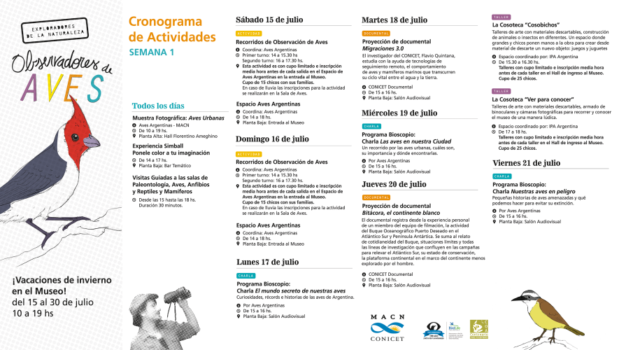El Museo Argentino de Ciencias Naturales “Bernardino Rivadavia” (MACN) y Aves Argentinas invitan estas vacaciones de invierno una serie de actividades bajo la consigna “Exploradores de la Naturaleza - Observadores de Aves”.