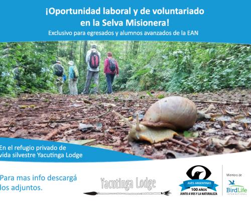 Yacutinga Lodge, refugio privado de vida silvestre incorporará un guía ambientalista y varios puestos voluntarios para su próxima temporada eco-turística de octubre a Abril de 2018 en Misiones, Arg