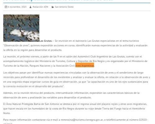 Noviembre 04 de 2015. Se reunirán en el balneario Las Grutas especialistas en el tema turístico “Observación de aves”, quienes expondrán acciones en curso, identificarán nuevas experiencias de la actividad y evaluarán la oferta en la región para desarrollar el producto.